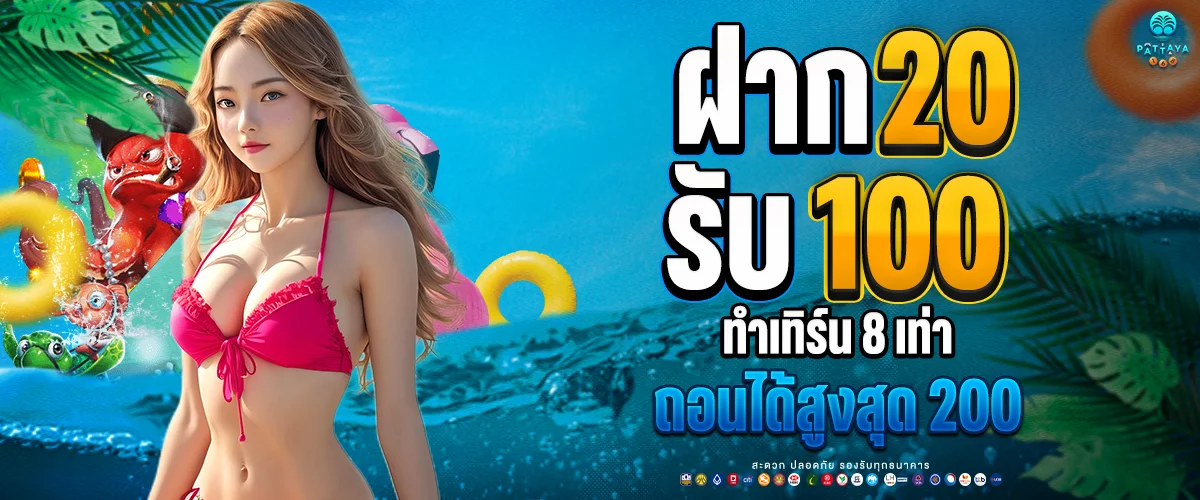 ฝาก 20 → รับเพิ่ม 80 = รวม 100 / ทำเทิร์น 8 เท่า / ถอนได้สูงสุด 200
